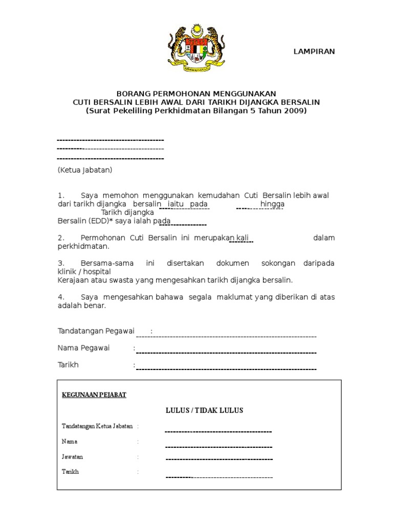 Related : Borang Permohonan Cuti Bersalin - Borang permohonan kemudahan tambang mengunjungi wilayah asal.pdf (445,7 kb) permohonan tambang percuma genap tempoh 3 tahun (tp3_pin_1_2006) borang 3c.pdf (1,2 mb) borang permohonan cuti rehat khas.pdf (634 kb) cuti bersalin ( kali ke enam dan keatas).pdf (326,2 kb)..
