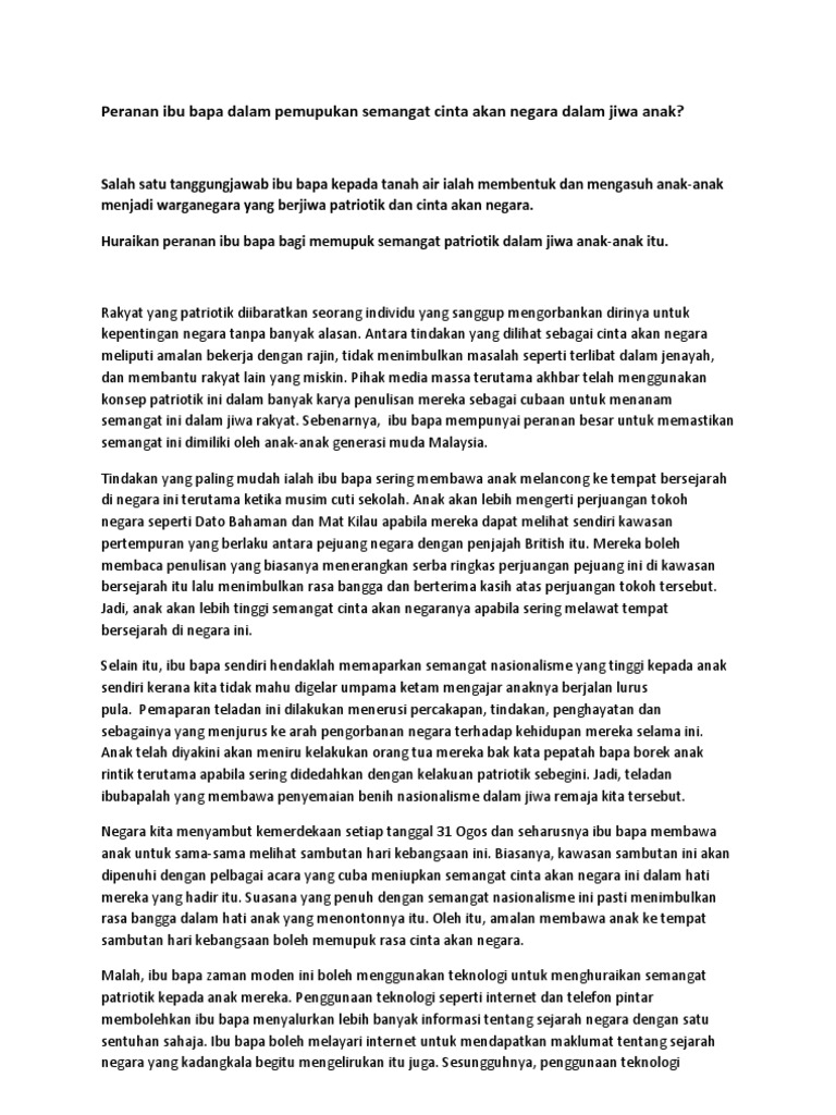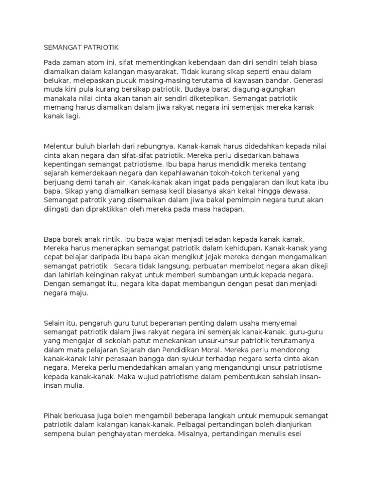 Semangat patriotisme ini perlu dipupuk sejak kecil lagi. Dapat memastikan kemerdekaan negara terpelihara 2. Dengan demikian, patriotisme dimaknai semangat untuk membela tanah air dan rela berkorban demi kemakmuranya. Cara pertama untuk memupuk semangat patriotisme ialah ibu bapa perlu memainkan peranan. Patriotisme yang juga disebut sebagai semangat patriotik ialah semangat cinta akan negara atau kesanggupan seseorang mempertahankan negara daripada kemusnahan. Patriotisme adalah semangat atau jiwa cinta kepada tanah air yang dapat patriotisme tidak berarti cinta kepada tanah air saja tetapi juga cinta kepada bangsa dan negara. Semangat patriotisme perlu dipupuk dan dihayati dalam segenap lapisan masyarakat, terutamanya golongan remaja. Pada zaman penjajahan, fokus rakyat ialah memperjuang kemerdekaan. Contoh karangan cara memupuk semangat patriotisme dalam kalangan murid dan masyarakat malaysia. Semangat patriotisme semangat untuk mencintai tanah air. Semangat patriotisme adalah penting kepada semua lapisan rakyat sesebuah negara. Dengan wujudnya perpaduan kaum, maka kerajaan akan dapat melaksanakan. Sikap kecintaan kepada tanah air tidak hanya.